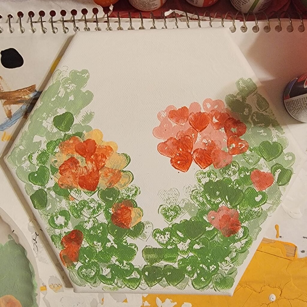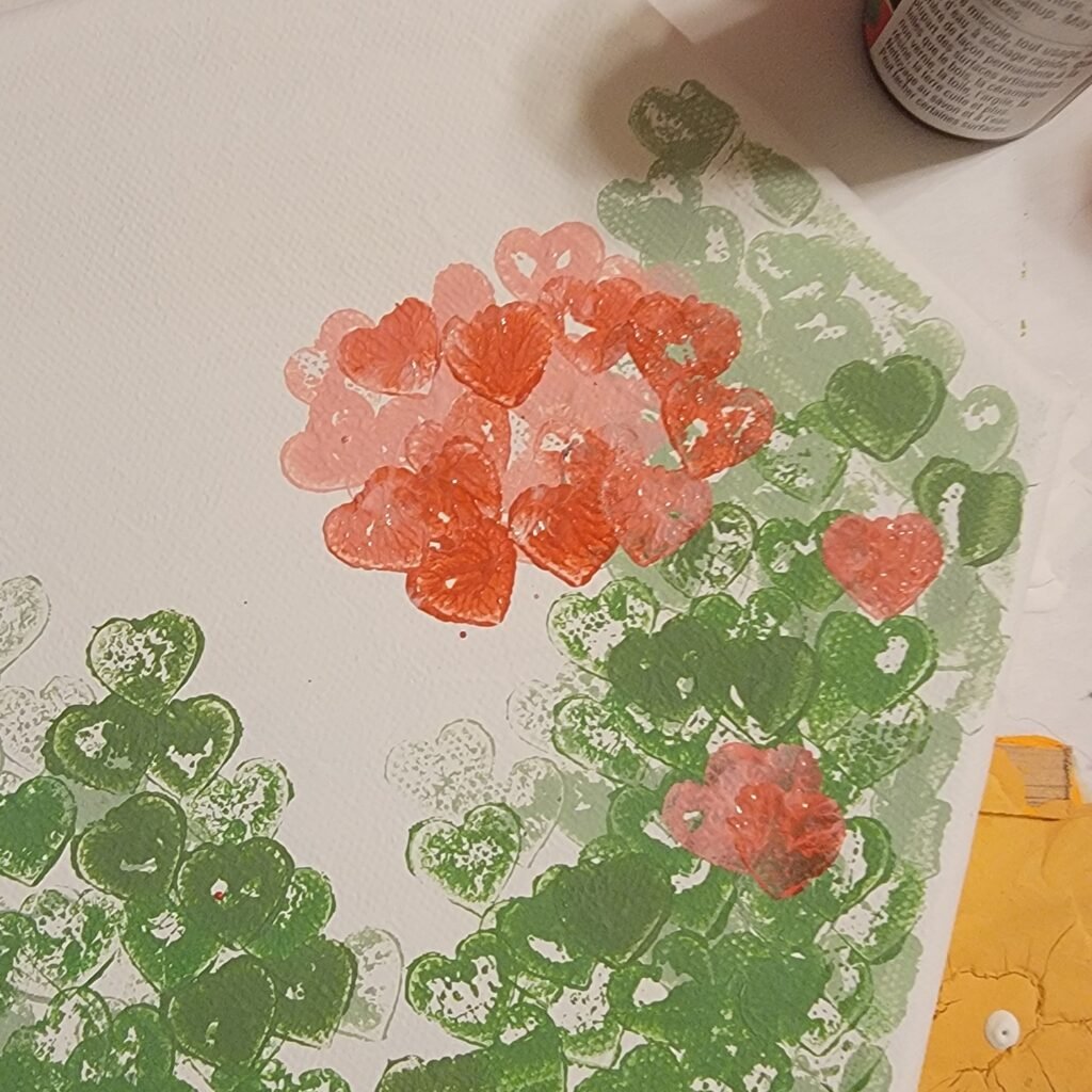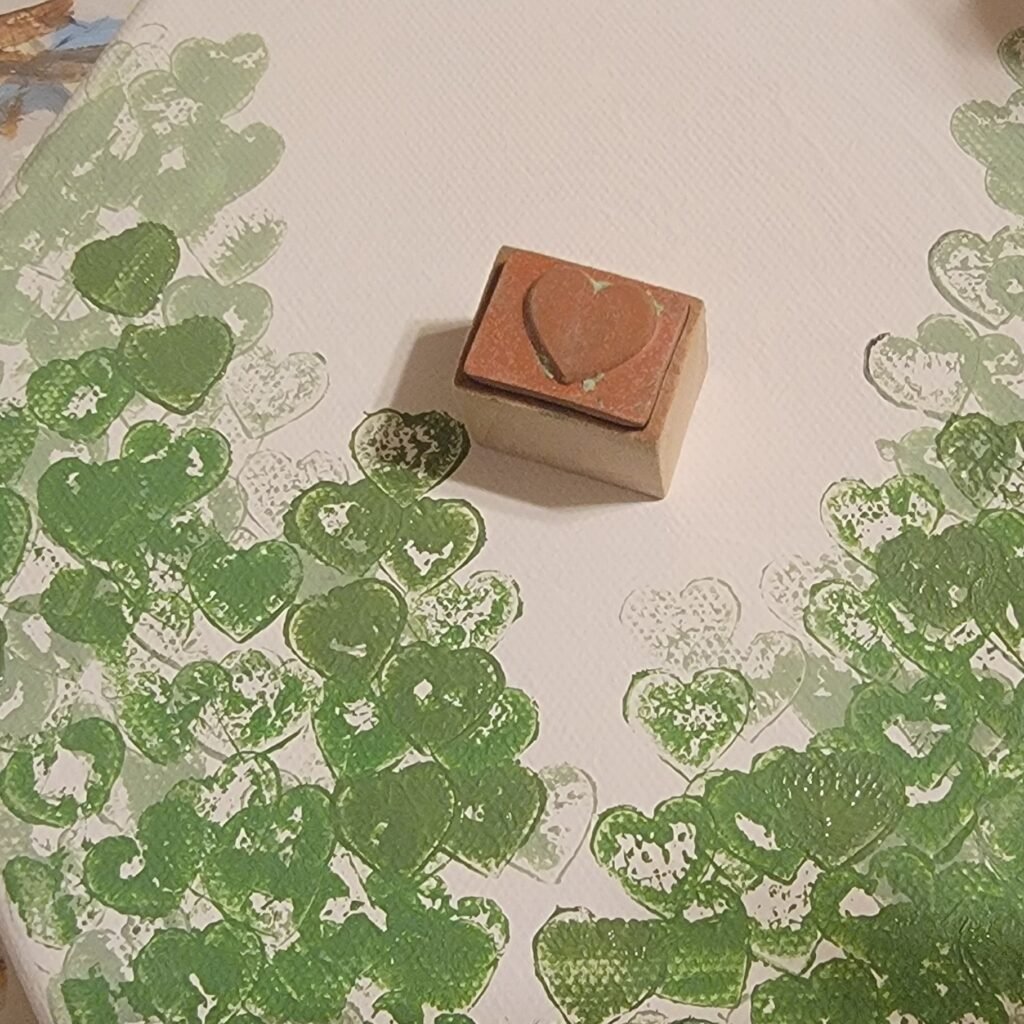 I chose three to four shades of green and began stamping hearts across the canvas. Sometimes I dipped the stamp into paint, other times I brushed paint directly onto the stamp. I rotated it, overlapped it, pressed lightly in some areas and heavier in others.