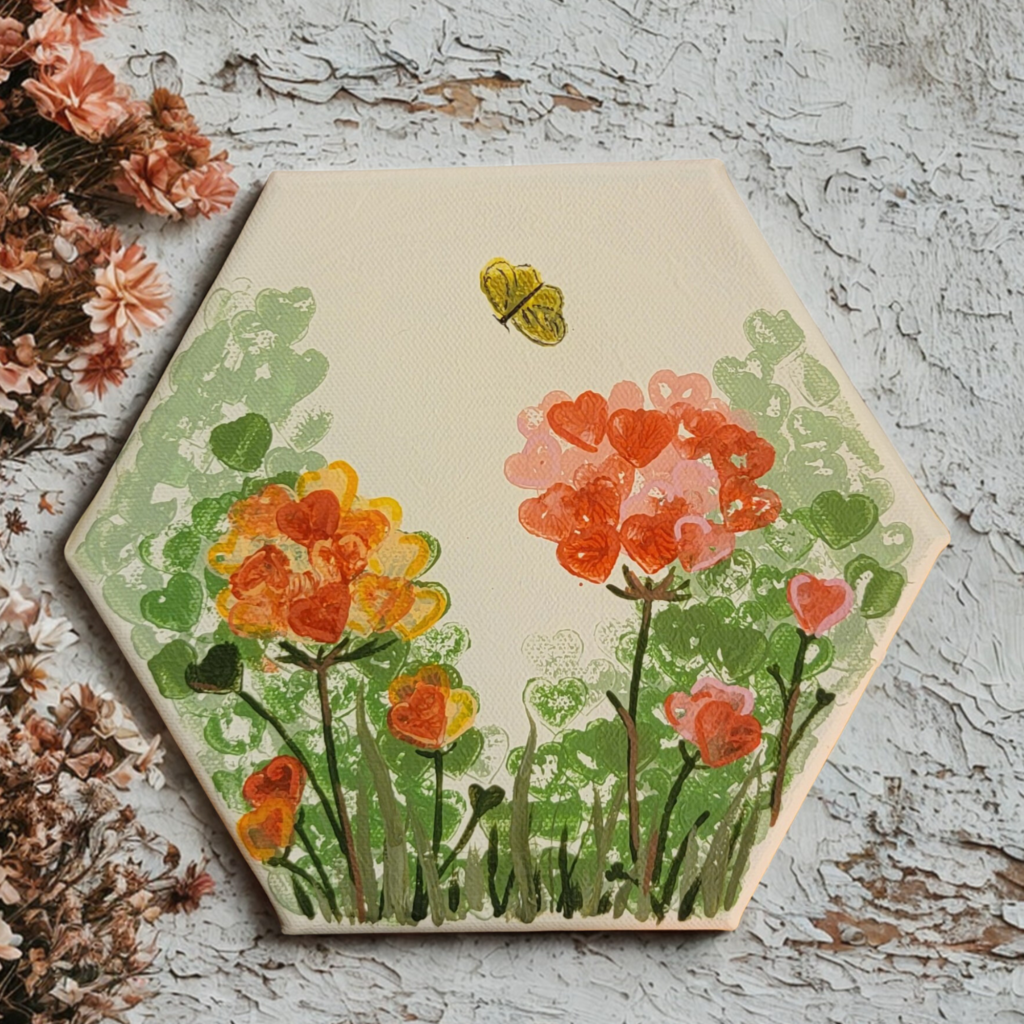 Then I introduced a warm orange-yellow for another layer of flowers. Suddenly the painting felt alive—like a garden growing itself. I was excited to see my art take shape!